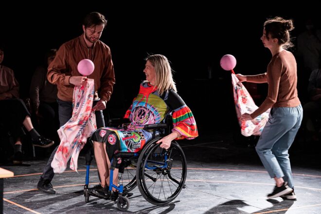 DDT spektaklis draminio veiksmo prasme tampa atsiminimų vakaru, kur aktorė demonstruoja judėjimo sunkumus, vis dėlto spektaklio epizodų virtinėje įsismelkia pasikartojimas ir monotonija. Važinėjimasis vežimėliu po scenografės Justīnės Jasjukevičos įrengtą stadioną sėdinčių žiūrovų rato viduryje atrodo įprastas ir lengvas, nors realaus žmogaus realiame gyvenime toks nebūna.